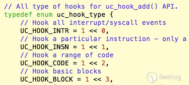 值得一提的是,Unicorn所提供的hook功能,就是在目標代碼翻譯成TCG時,插入相關的TCG指令,從而在最終翻譯得到的TB中,于指定位置處回調hook函數。而由于TCG指令和架構無關,因此添加的TCG指令可以直接適用于不同架構。