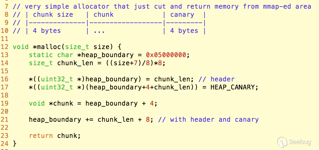 malloc()調用,就直接從這片內存中切一塊出來。而為了檢測可能發生的堆溢出漏洞,我們參考棧溢出檢測的機制,在malloc()分配的內存末尾加上一個固定的canary,并在頭部寫入這塊內存的大小,以便后續檢查。free()也被簡化為空,因此不需要進行內存回收、合并等復雜操作。mipsel-linux-gnu-gcc -shared -fPIC -nostdlib -Xlinker --hash-style=sysv demo-libcpreload.c -o demo-libcpreload.so