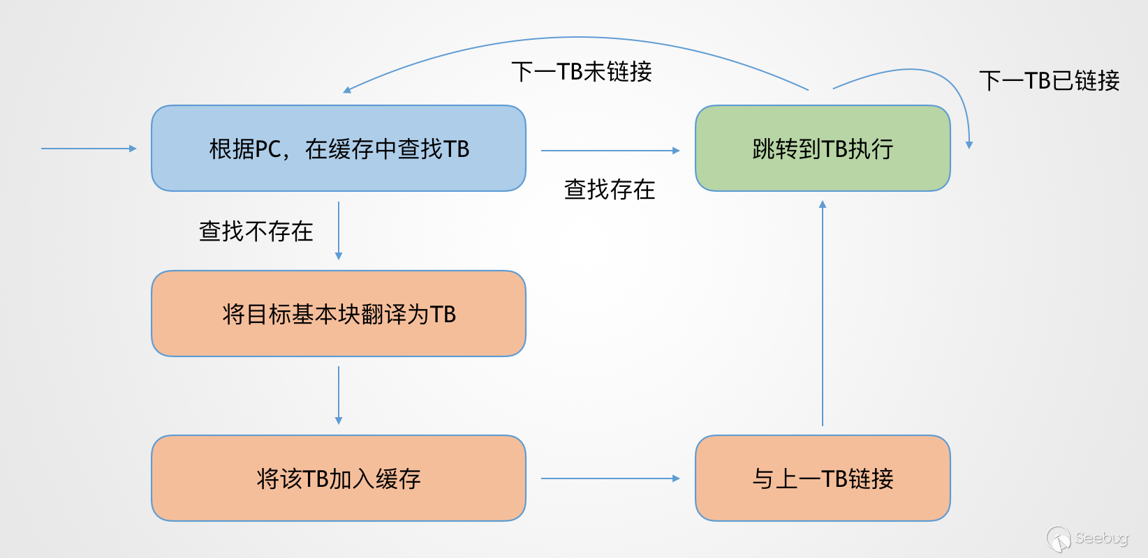 而為了提高模擬運行的效率,QEMU還加入了TB緩存和鏈接機制。通過緩存翻譯完成的TB,減少了下次執行時的翻譯開銷,這即就是Unicorn所說的JIT。而TB鏈接機制,則是把原始代碼基本塊之間的跳轉關系,映射到TB之間,從而盡可能地減少了查找緩存的次數和相關的上下文切換。