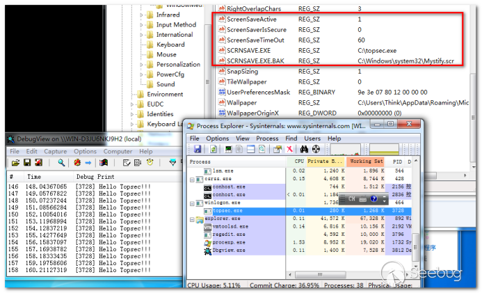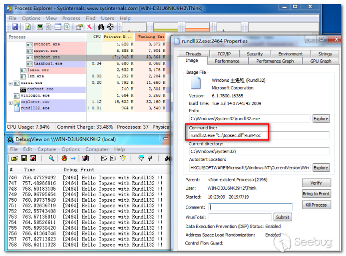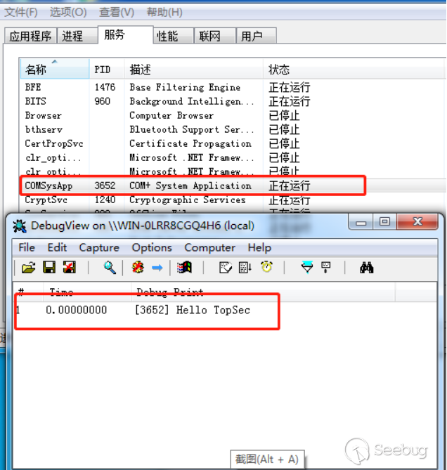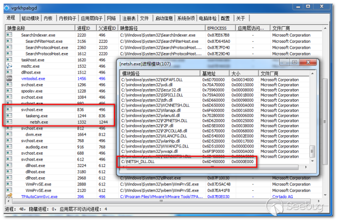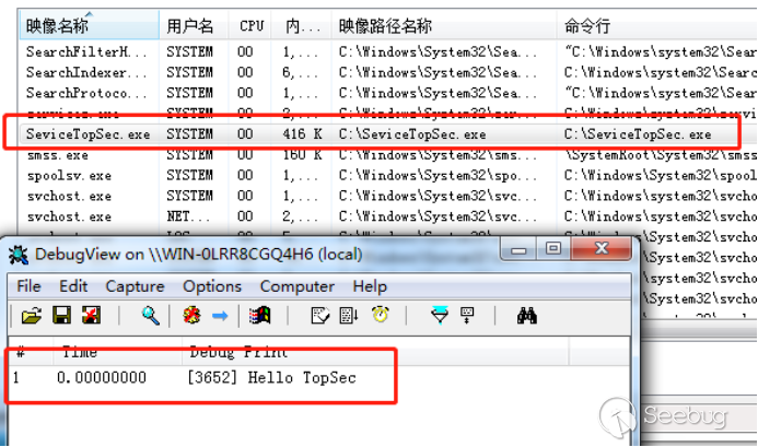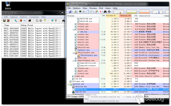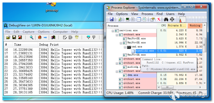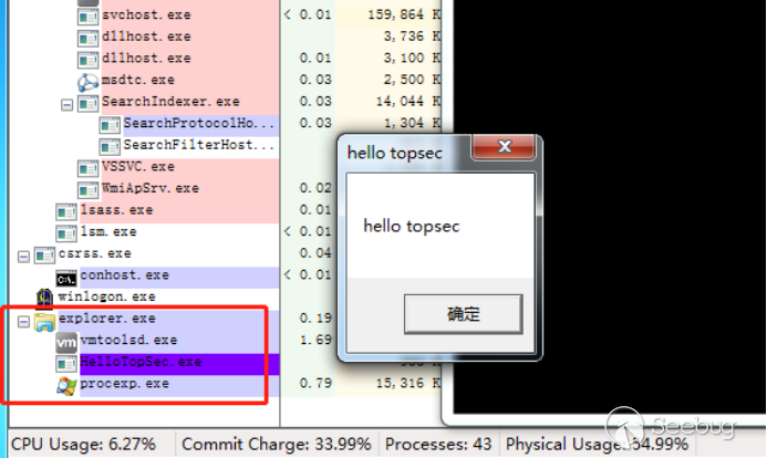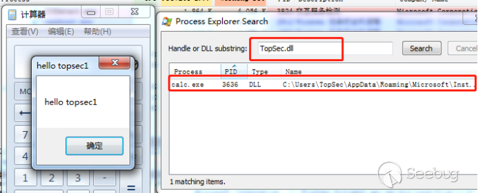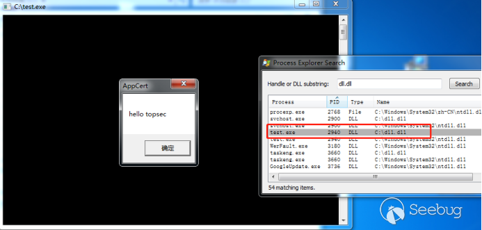 可以看到test.exe中已經加載dll.dll,并彈出“hello topsec”。也能發現,在svchost.exe和taskeng.exe中也加載了dll.dll。