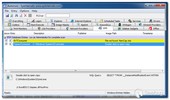 運行該程序后,會在系統中安裝WMI事件,使用AutoRun工具查看WMI相關的數據