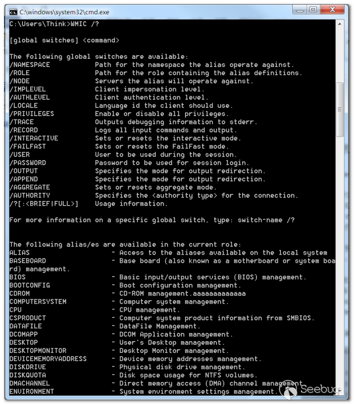 WMI允許通過腳本語言(VBScript 或 Windows PowerShell)來管理本地或遠程的Windows計算機或服務器,同樣的, 微軟還為WMI提供了一個稱之為Windows Management Instrumentation Command-line(WMIC)的命令行界面,我們還可以通過WMIC工具來管理系統中的WMI。