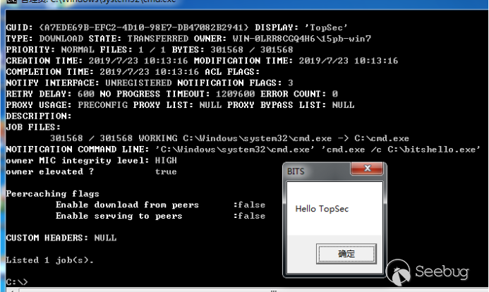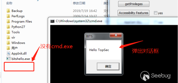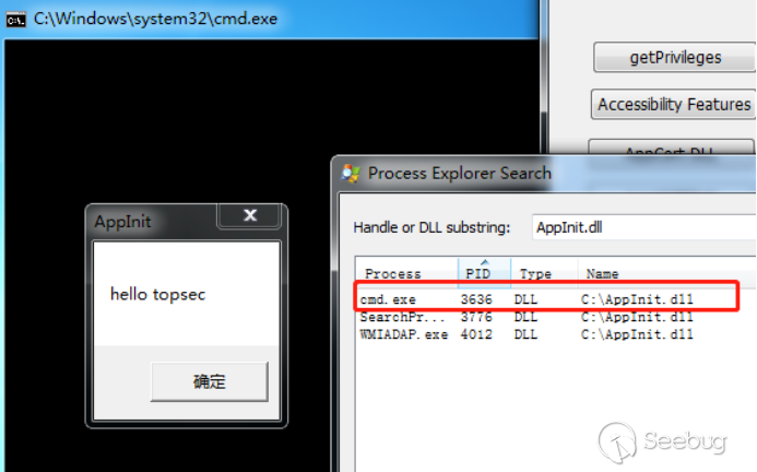 運行cmd.exe,就會發現cmd.exe已經加載指定dll,并彈框。