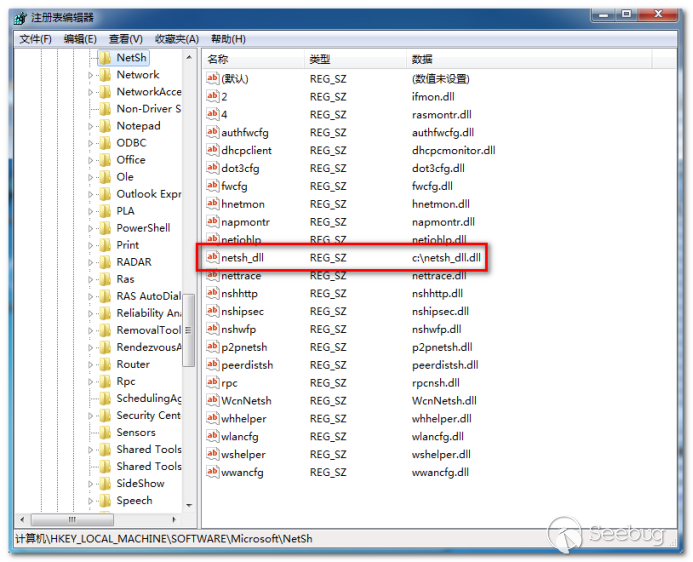 1、檢查注冊表路徑HKLM\SOFTWARE\Microsoft\Netsh,查看是否有不明來源的Helper DLL注冊信息并刪除。