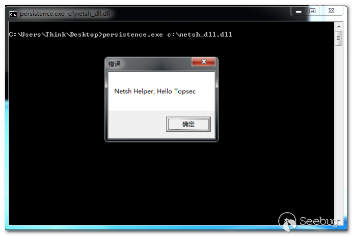 MessageBox(NULL, _TEXT("Netsh Helper, Hello Topsec"), NULL, MB_OK);