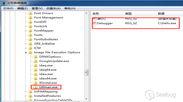 簡單操作就是修改注冊表,在“HKEY_LOCAL_MACHINE\SOFTWARE\Microsoft\Windows NT\CurrentVersion\Image File Execution Option”中添加utilman.exe項,在此項中添加debugger鍵,鍵值為要啟動的程序路徑。