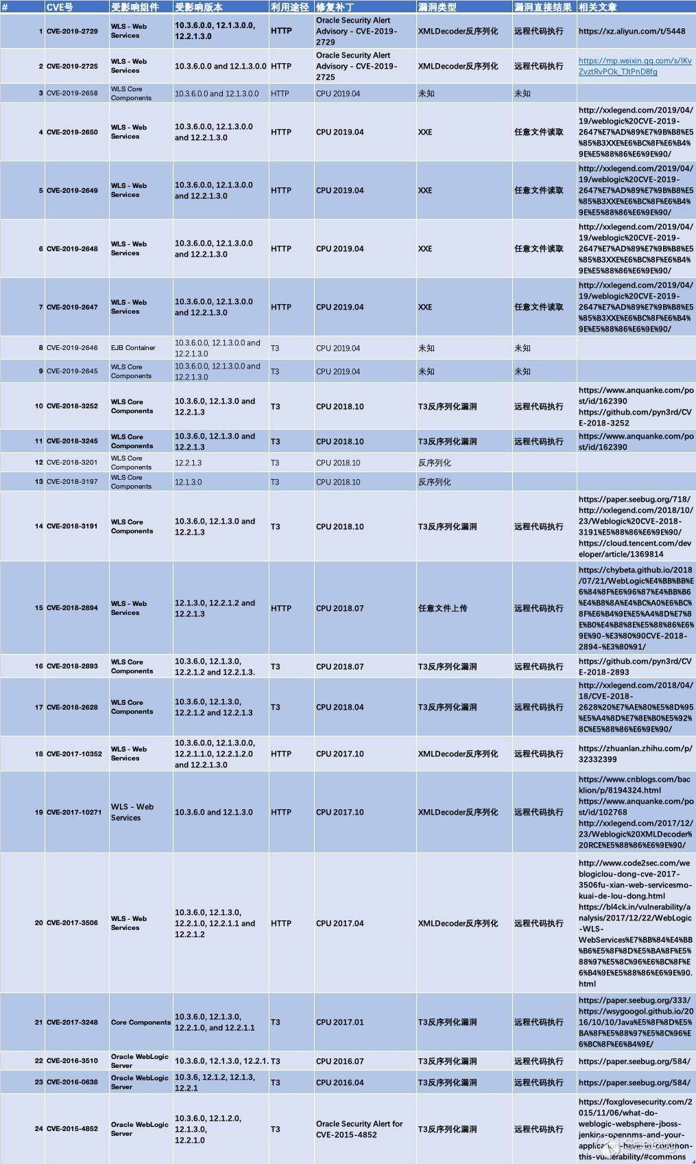 下表列出了一些WebLogic已經爆出的漏洞情況: