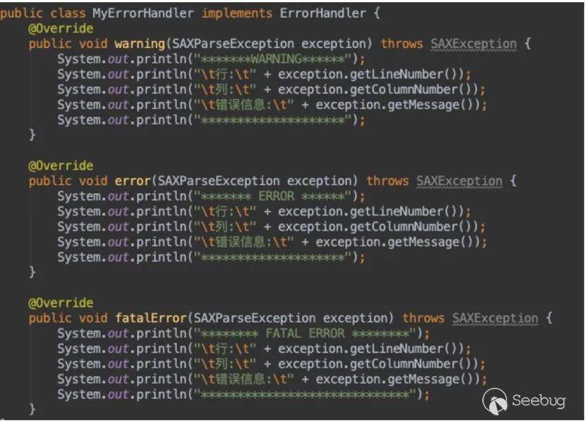然后實現ErrorHandler, ErrorHandler是負責處理一些解析時可能產生的錯誤。