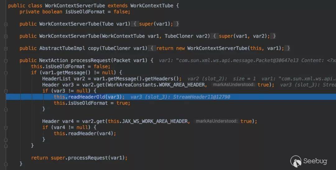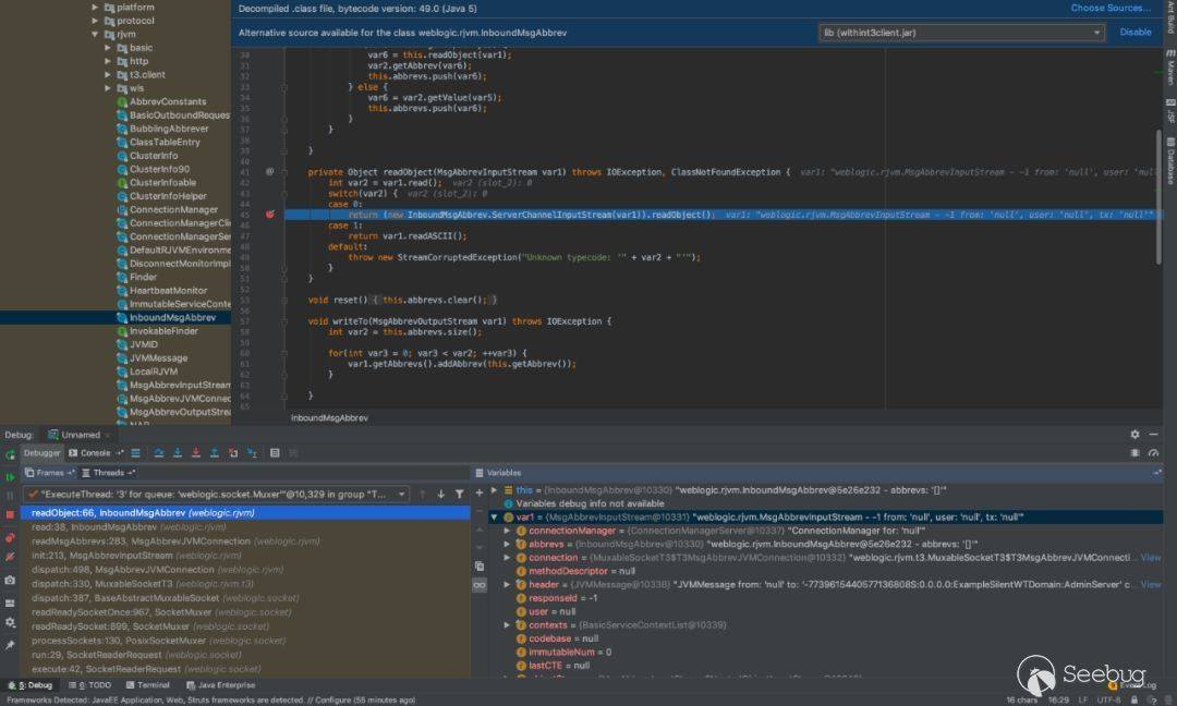 簡要的分析一下這個漏洞,遠程調試時斷點應下在wlserver/server/lib/wlthint3client.jar/weblogic/InboundMsgAbbrev的readObject()中。