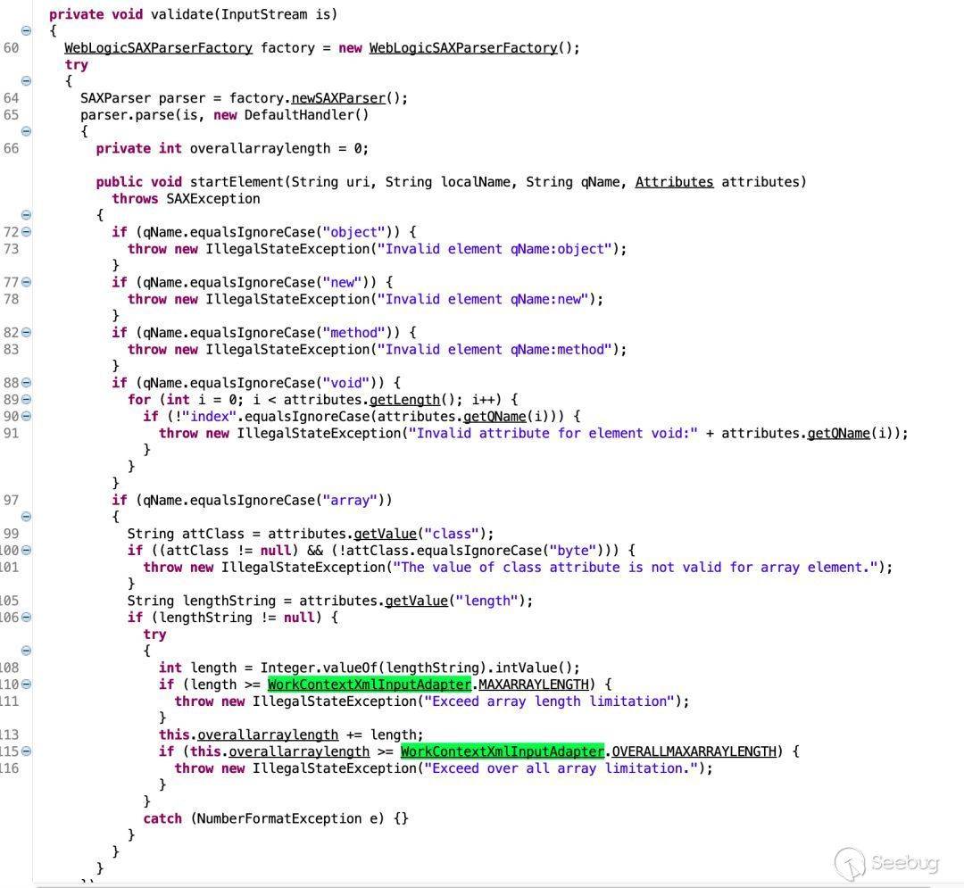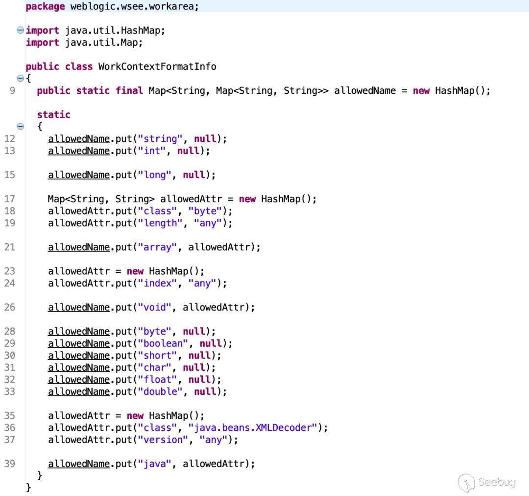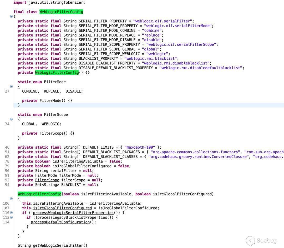 WebLogic T3反序列化漏洞用黑名單的方式修復,補丁位置在Weblogic.utils.io.oif.WebLogicFilterConfig.class: