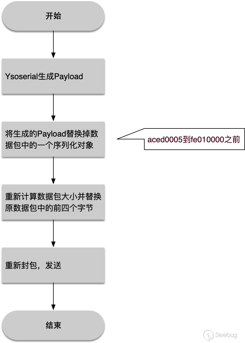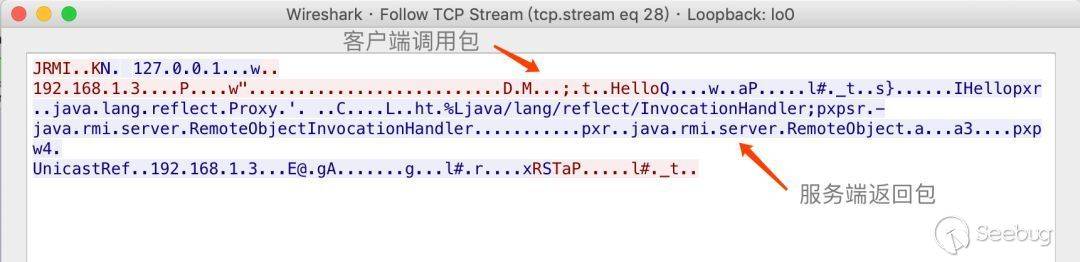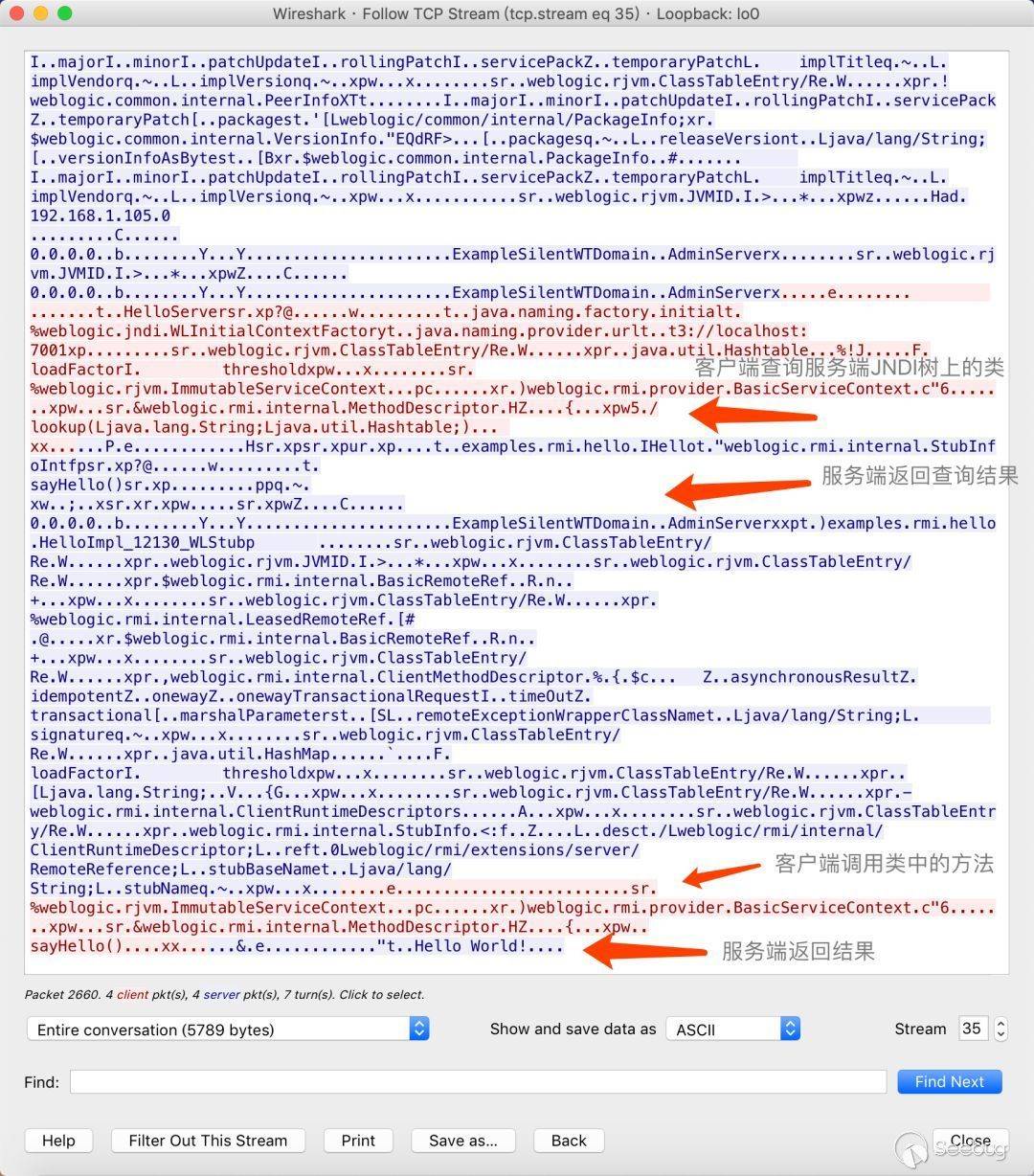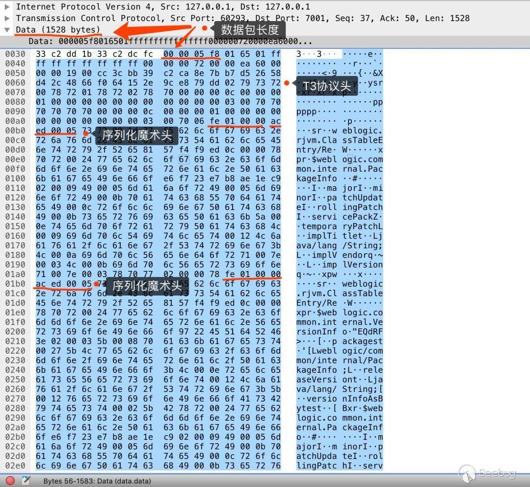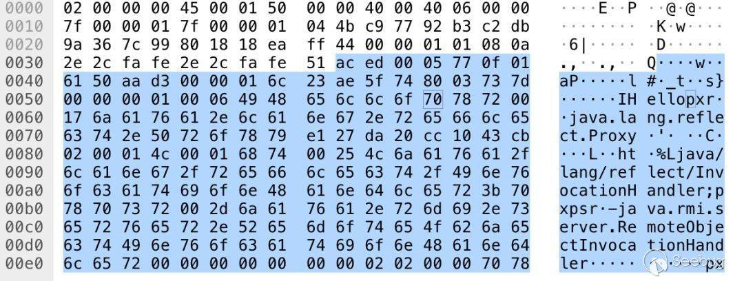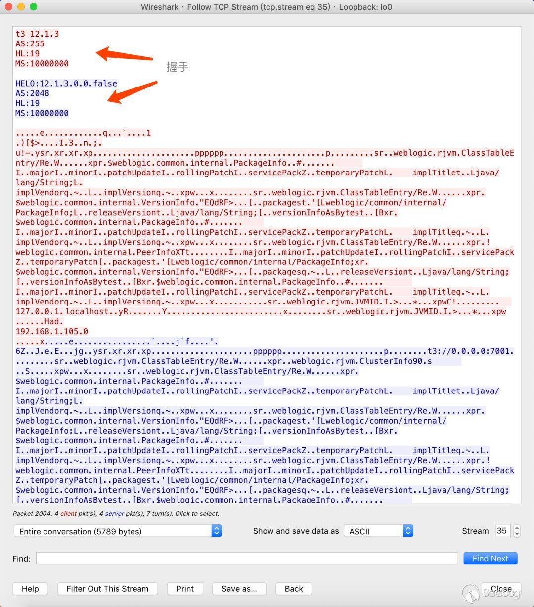 很好,和上面抓到的包一樣,握手成功。繼續下一步。下一步我需要替換掉握手后的第一個數據包中的一組序列化數據,這個數據包原本是客戶端請求WebLogic RMI發的T3協議數據包。假設我們替換第一組序列化數據: