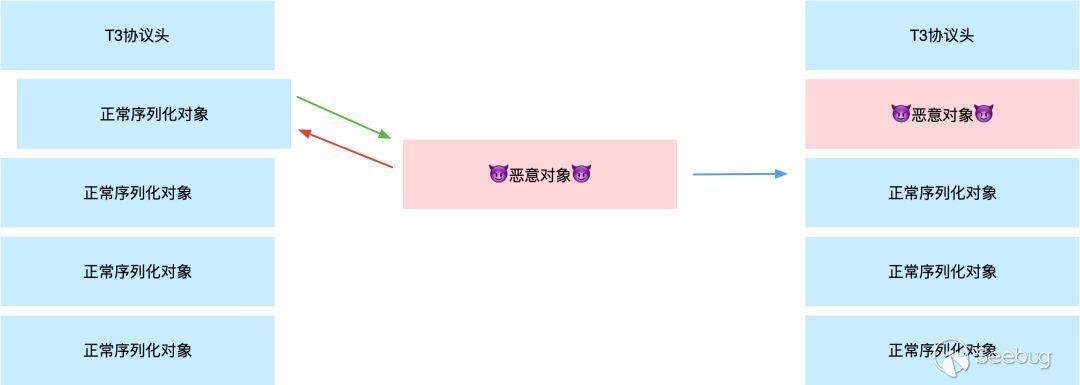當服務端允許接收遠端數據進行反序列化時,客戶端可以提供任意一個服務端存在的目標類的對象 (包括依賴包中的類的對象) 的序列化二進制串,由服務端反序列化成相應對象。如果該對象是由攻擊者『精心構造』的惡意對象,而它自定義的readObject()中存在著一些『不安全』的邏輯,那么在對它反序列化時就有可能出現安全問題。