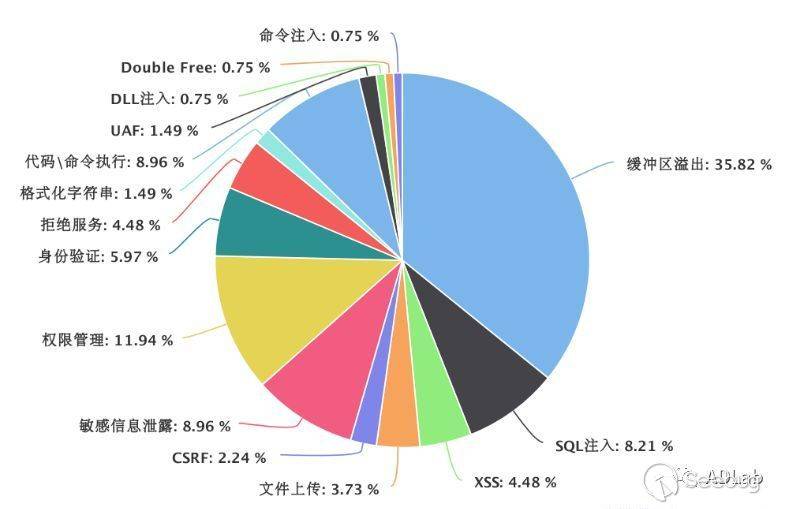 從圖中可以看出WebAccess的歷史漏洞類型比較豐富,包括了緩沖區溢出、SQL注入、XSS、權限管理不當、敏感信息泄露、代碼\命令執行等。其中緩沖區溢出類型漏洞最多,占到漏洞總數的1/3以上;其次是權限管理類漏洞(11.94%)、敏感信息泄露(8.96%)、SQL注入(8.21%)。由此可以看出,WebAccess的漏洞面較為廣泛。