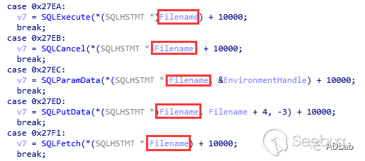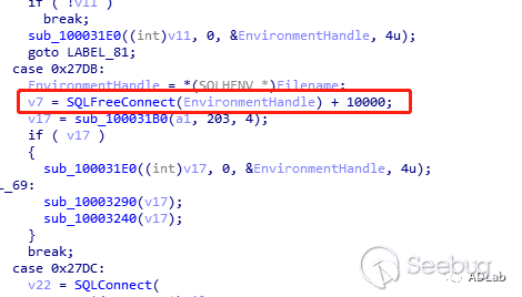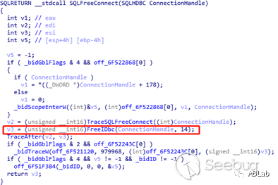 通過分析,Filename變量直接來源于webvrpcs接收的RPC數據,通過修改該Filename的值可以控制SQLFreeConnet的參數。分析SQLFreeConnet函數,其調用了函數FreeIDbc釋放連接句柄ConnectionHandle(即SQLFreeConnet參數)。