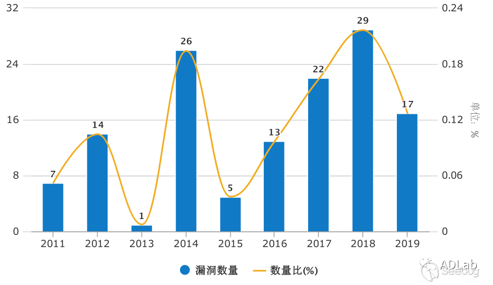 通過追蹤CVE漏洞數據庫中的Advantech WebAccess歷史漏洞,啟明星辰ADLab發現從2011年到2019年合計有134個漏洞被披露。圖1是我們統計的每一年的漏洞披露數量: