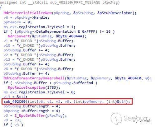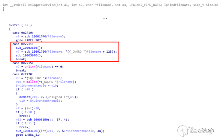 sub_401260(圖6所示偽代碼)首先對RPC消息的頭部數據進行處理,然后調用sub_402c60函數。sub_402c60函數最終調用DsDaqWebService函數(如圖7所示),而DsDaqWebService函數源于動態鏈接庫drawsrv.dll。用IDA打開drawsrv.dll并定位到函數DsDaqWebService,DsDaqWebService函數實現了各個不同IOCTL code的功能,而0x2711對應的處理函數為sub_100017B0。