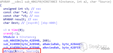 WebAccess Node軟件包含了一系列小組件程序,bwscrp.exe是其中一個。bwscrp.exe程序入口函數接收兩個命令行參數(如圖16),隨后使用命令行參數lpCmdLine作為函數參數之一調用了函數sub_4061F0。在函數sub_4061F0中,Source即為lpCmdLine,后續執行直接使用strcpy將Source拷貝到棧參數Dest,而沒有檢查Source的數據長度。由于變量Dest距離棧頂只有400字節,當Source長度超過404字節時, strcpy函數調用將覆蓋棧上的函數返回地址,是一個典型的棧溢出漏洞。
