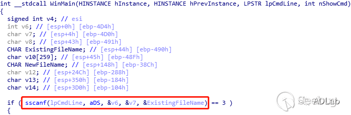 此外,CVE-2019-6550 (ZDI-19-585 ZDI-19-330 ZDI-19-329 ZDI-19-328 ZDI-19-327 ZDI-19-325 ZDI-19-323)漏洞原理同CVE-2019-10991也極為類似。CVE-2019-6550(ZDI-19-330)棧溢出漏洞存在于upandpr.exe。該程序主函數中的scanf調用將用戶提供的數據拷貝到棧內存,在拷貝之前未對用戶提供的數據長度進行驗證,如圖18所示。