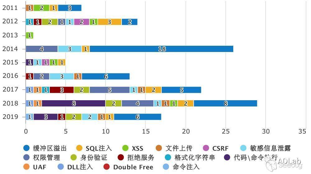 為了分析WebAccess漏洞類型的演變趨勢,我們對其歷年不同漏洞類型的數量進行了梳理,如圖3: