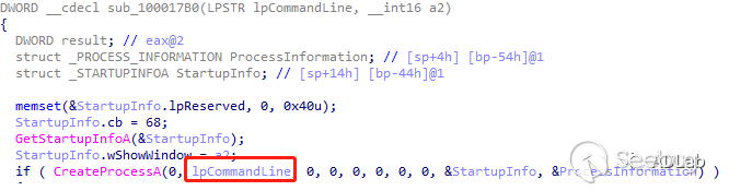 分析sub_100017B0(圖8所示),該函數中調用了CreateProcessA()函數創建進程。其中lpCommandLine參數由RPC客戶端發送,且此處未對此參數進行任何檢查。因此,可以通過控制該參數使得CreateProcessA()執行任意命令,從而導致遠程命令執行。
