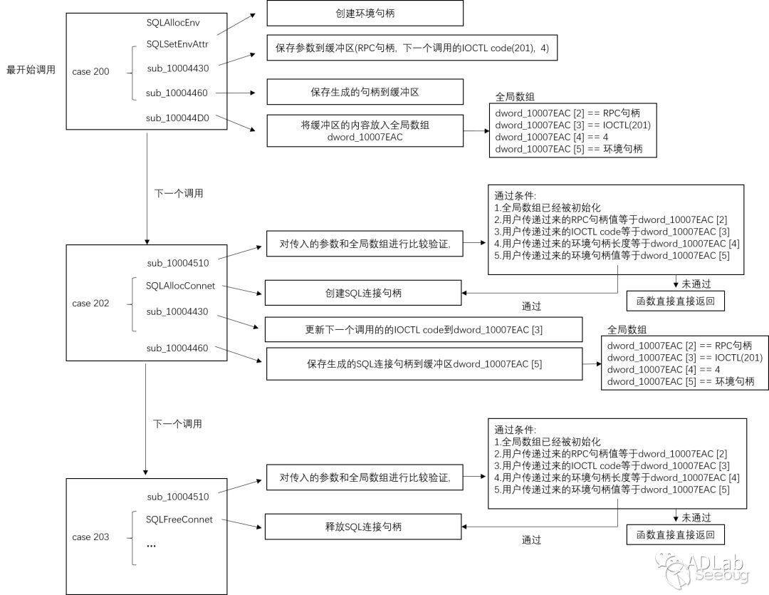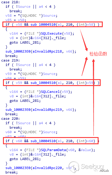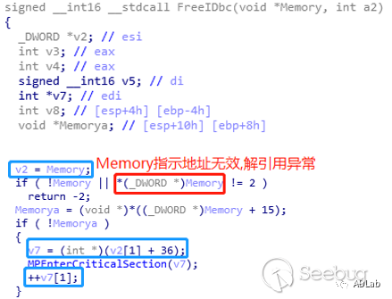 在FreeIDbc函數中,ConnectionHandle會被視為指針類型解引用。因此,通過構造RPC消息可控制指針解引用,從而造成內存訪問錯誤。
