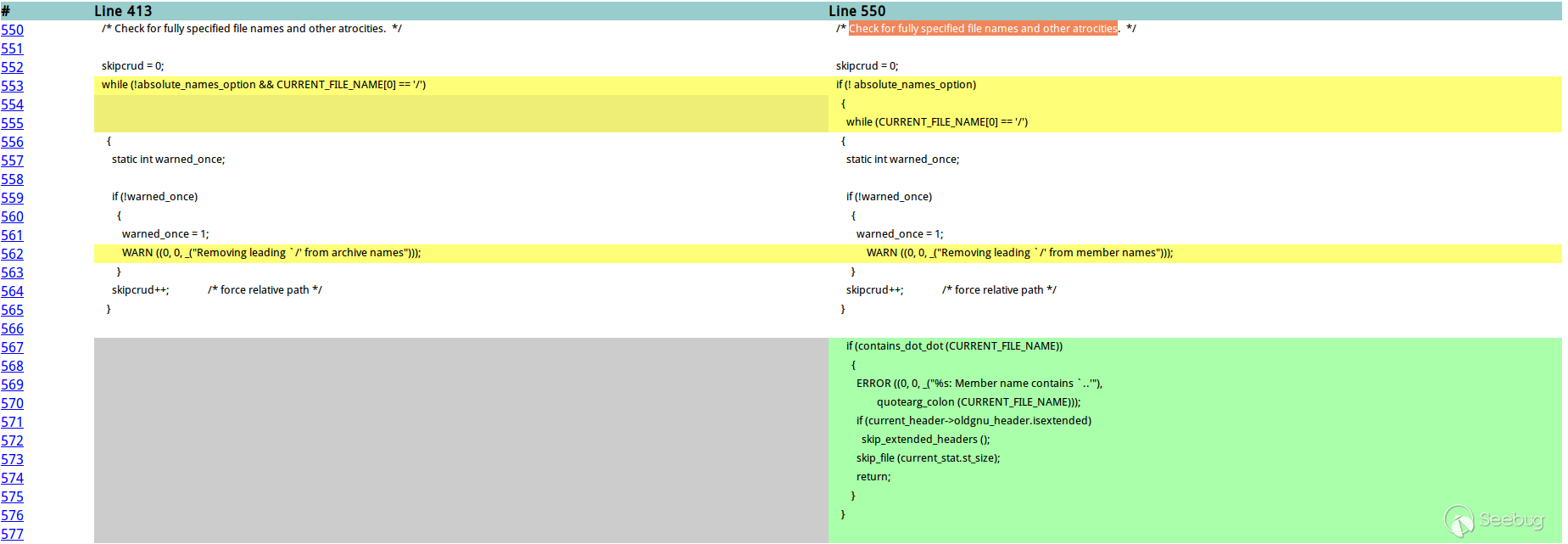 上圖中,綠色代碼區的功能就填補了之前安全檢測的空白。它首先遍歷CURRENT_FILE_NAME,如果存在".."就會警告"Member name contains`..'",然后跳過這些文件,不去處理它們。而左邊的灰色空白區域表明之前的版本缺少安全檢測,"../"字符串就能繞過解壓路徑將文件寫到任意位置。