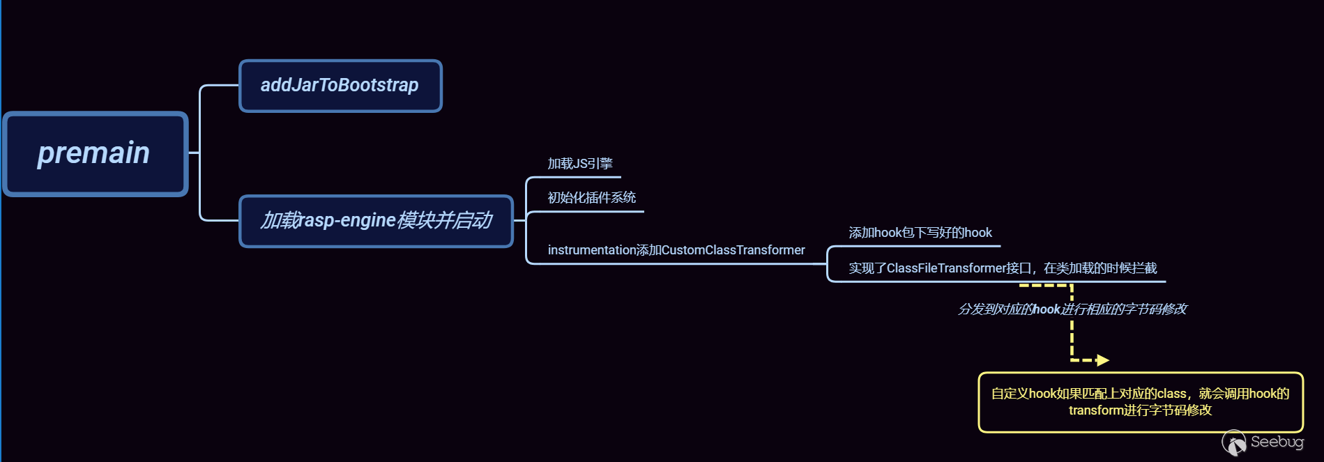 OpenRasp的入口在agent的premain方法,premain方法會在main方法運行之前先運行。大概梳理了一下與instrumentation有關的調用的流程