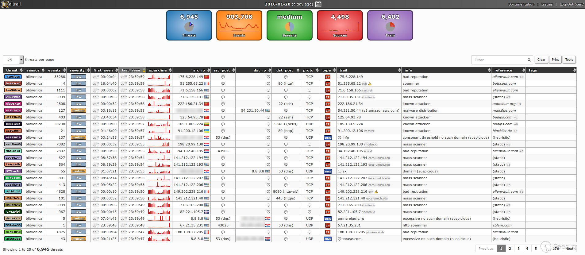 Maltrail是一個檢測惡意流量的系統,利用包含惡意或可疑線索的公共可用(黑)名單,還有從各種AV報告和自定義用戶定義列表中編譯的靜態跟蹤,其中跟蹤可以是任何內容——域名(例如zvpprsensinaix.com針對惡意軟件 Banjori)、URL(如針對已知惡意的executablehXXp://109.162.38.120/harsh02.exe)、IP地址(如針對已知攻擊者185.130.5.231)或HTTP User-Agent 頭部值(如針對自動SQL的sqlmap注入數據庫成為收購工具)。此外,它使用先進的啟發式機制,可以幫助發現未知的威脅(如新的惡意軟件)。