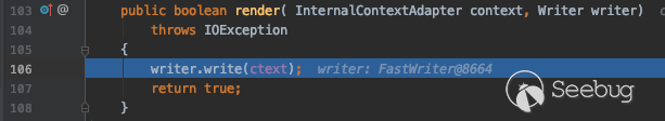 這行代碼是,我們可以看到此時的data就是ASTprocess節點,所以Template.merge方法中調用了AST的根節點(ASTprocess)的render方法((SimpleNode)data).render(ica,writer);。此調用將迭代處理各個子節點render方法。如果是ASTReference類型的節點則在render方法中會調用execute方法執行反射替換相關處理。
