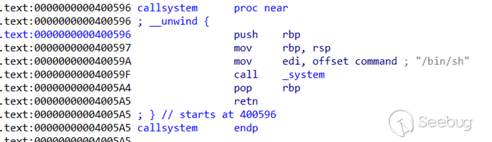 所以構造level0的payload為padding+bp+pc,其中padding覆蓋棧空間為0x80字節大小。由于程序開啟了nx保護(no execute,代碼頁不可執行),所以我們不能在函數返回的位置(pc)直接添加shellcode執行任意代碼。nx保護一般的繞過方式是代碼重用,即利用可執行代碼頁的代碼來達到我們想要的任意代碼執行的目的。仔細觀察這個題目中有一個函數叫callsystem,跟進發現是一個執行system(‘/bin/sh’)的預置后門,所以我們把pc賦值成callsystem的地址400596即可。