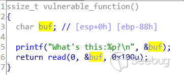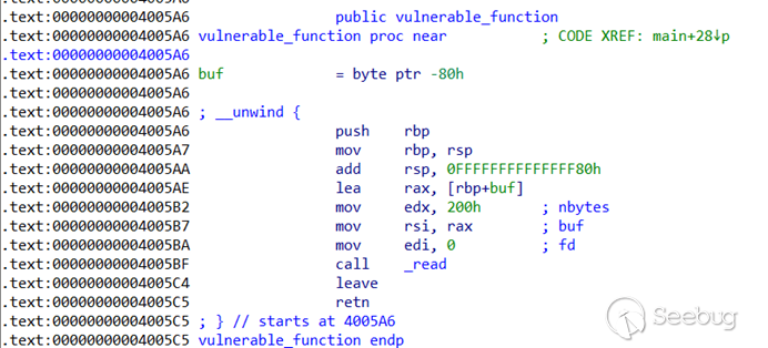 仔細觀察不難發現vulnerable_function中調用了read(0,buf,0x200),其中buf的位置是rbp-0x80,從標準輸入(fd=0)讀取的字符長度為0x200,這樣就造成了棧溢出。