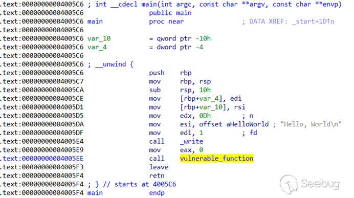 可以看到程序保留了符號表(這里也可以使用IDA的反編譯功能F5查看代碼,不過為了避免IDA反編譯的錯誤和一些數據類型導致的漏洞建議練習使用匯編查看關鍵代碼),在入口點main函數中先調用write(1,”Hello, World\n”,0xd)在控制臺輸出了Hello,World\n的字符串(在Linux中,文件流fd為0、1、2分別代表標準輸入、標準輸出和標準錯誤輸出,在程序中打開文件得到的fd從3開始增長);然后將write的返回值(eax)清零,并調用了一個叫vulnerable_function的函數,根據名字可以猜測這個函數是存在漏洞的。