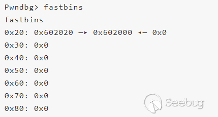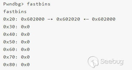 Shellphish給出的例子中先申請了3個0x8大小的堆(同樣地申請c的原因是避免合并到topchunk),然后釋放a( 再次釋放a構成doublefree雙重釋放,但是由于glibc在釋放fastbin大小的堆時檢查且僅檢查fastbin頭部的堆和要釋放的堆是否相等,若相等則報錯),為了繞過glibc在釋放堆時對bin頭結點的檢查,我們free(b),此時fastbin如下(b=0x602020,a=0x602000;由于fastbin是單鏈表且LIFO,后釋放的b被插入到鏈表頭)