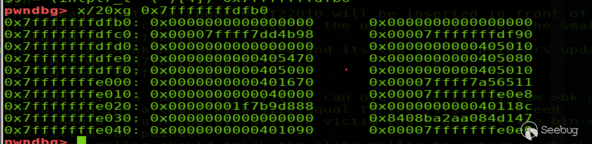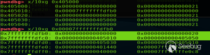 示例中在棧中偽造了一個0x20大小的堆(偽造堆頭如下圖選中部分,其中a=0x405000,&stack_var=0x00007fffffffdfb0),此時堆a的fd指向&stack_var,即fastbin:a->stack_var,此時第二次申請不超過0x18大小的堆(64位系統,跟申請堆時字節對齊有關,返回的堆的大小會被轉化成滿足條件的最小2*size_sz的倍數,最大0x10+8,8字節可占用下一個堆的prev_size)即可返回棧地址處的偽造堆。
