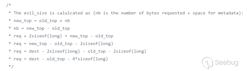 然后申請一個evilsize大小的堆改變topchunk的位置。evilsize的計算如下,這么計算的原因是當bin都為空時會從topchunk處取堆