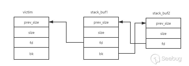 再次申請一個largechunk,觸發fastbin的合并過程并使fastbin的堆進入unsortedbin的處理流程,victim處于smallbin的范圍最終被鏈入smallbin頭結點。而由于我們事先構造了如上的fake smallbin鏈,此時smallbin的鏈接情況是smallbin:victim->stack_buf1->stack_buf2。