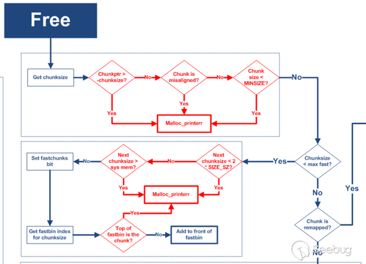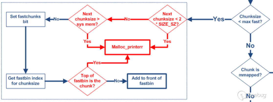 其中fastbin范圍的堆釋放時的檢查如下圖所示,