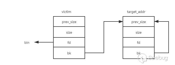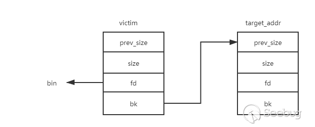 利用偽造smallbin鏈表來最終達到一次任意地址分配內存的效果。前提是可以在要分配的地址處偽造堆(修改結構體中fd、bk的指向),且可以修改victim堆(被釋放的smallbin堆)的bk指針。