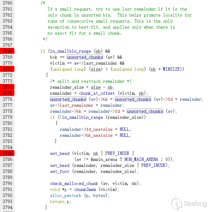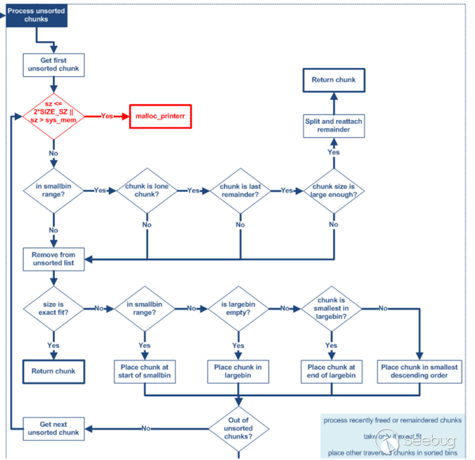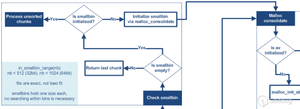 從實現中可以看出smallbin鏈接的chunk中包含一部分fastbin大小的堆,fastbin范圍的堆是有可能被鏈入其他鏈表的。當用戶申請smallbin大小的堆而smallbin又沒有初始化或者申請大于smallbin最大大小的堆時,fastbin中的堆根據prev_inuse位進行合并后會進入如上unsortedbin的處理流程,符合smallbin或largebin范圍的堆會被鏈入相應的鏈表。