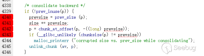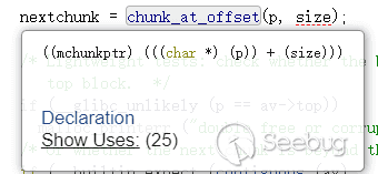 首先是prevsize要修改成fakechunk的大小(包含堆頭,原因是glibc尋找下一個堆的宏如下,即將當前堆偏移size的數據視為下一個堆)