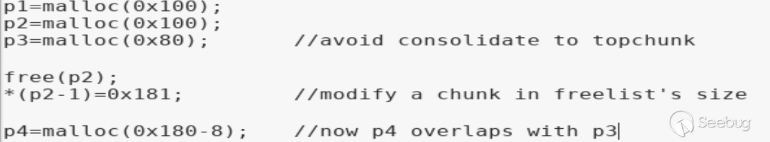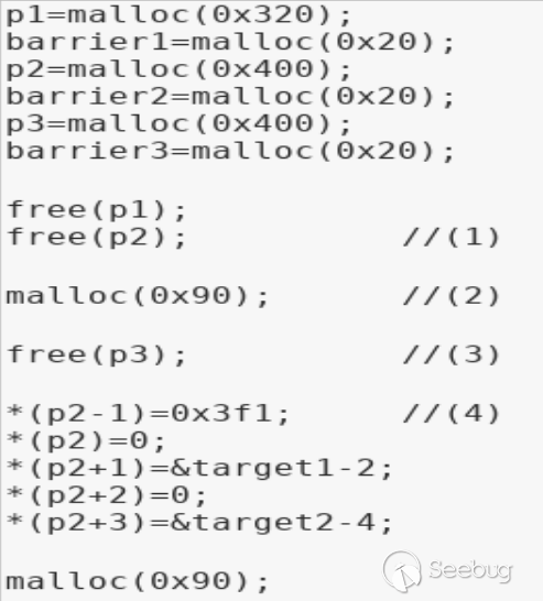 首先要申請如上圖3個堆和相應的為了避免合并到topchunk的barrier(只申請barrier3應該就夠用了,shellphish這么寫可能是在之后復雜的申請釋放中不在考慮合并到topchunk的情況),其中p1要保證是smallbin且非fastbin范圍(且保證在后續申請堆時堆大小夠用),p2、p3要保證是largebin范圍。