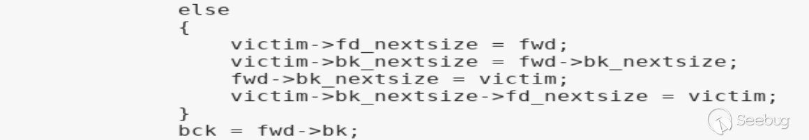 Largebin的分配策略是best fit,即最終取出的堆是符合申請內存的最小堆(記為chunk)。若取出的chunk比申請內存大至少minsize,則分割chunk并取合適大小的剩余堆做為last remainder;若取出的chunk比申請內存不大于minsize,則不分割chunk直接返回做為用戶申請內存塊。