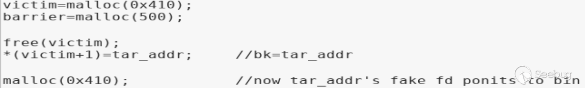 這樣在申請得到victim后會將victim斷鏈,從而target_addr fake chunk的fd會指向相應的bin,進而可以泄露libc基址。(當然也可以泄露bk之類位置的其他信息,如果有的話;p)