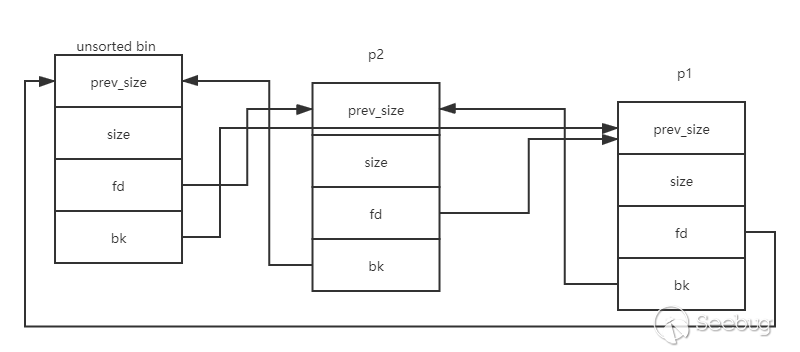 (1)然后依次釋放p1、p2,由于非fastbin范圍的堆在釋放后會首先鏈入unsortedbin,此時unsortedbin的情況是。(簡單說就是unsortedbin:p2->p1,其中各個指針的指向如圖)