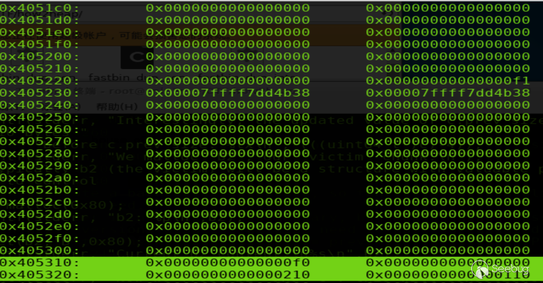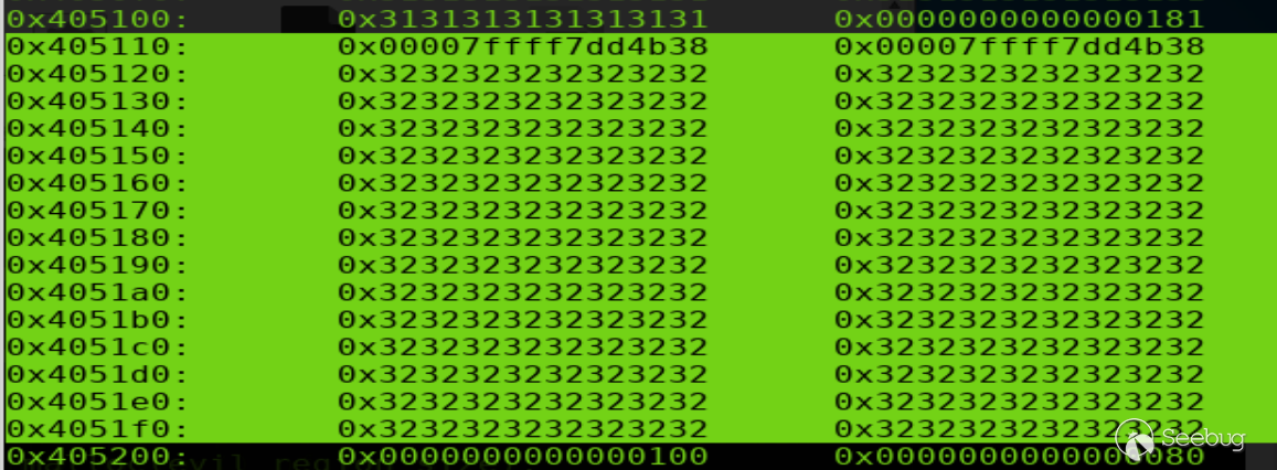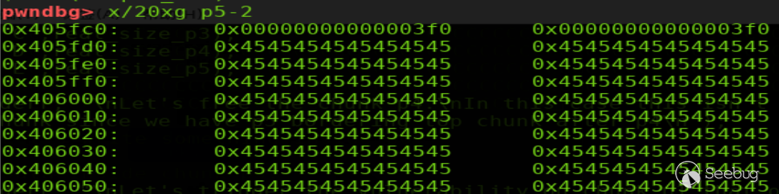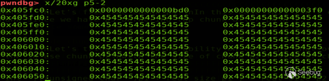 過程如上。修改位于bin的p2的size域,修改后p2結構如下(p2=0x405110,選中部分為p2 data部分)