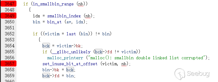 由于smallbin的exact fit和fifo策略,此時申請一個victim大小的堆會直接返回bin結點bk指向的victim(bin的結構體是mchunkptr*),然后斷鏈并修改bin的bk指針指向victim的bk節點即stack_buf1。glibc取smallbin的chunk源碼如下。