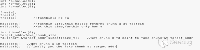 示例中先申請了3個0x8大小的堆,然后通過free(a)、free(b)、free(a)構成一次doublefree(原理同fastbin_dup),此時fastbin的連接狀態是a->b->a。再次申請兩個0x8大小的堆,由于fastbin的lifo,此時fastbin中只剩a,且此時堆a存在于fastbin和用戶申請的堆中,即我們可以控制一個存在于fastbin的堆的內容。容易想到的一種利用方式是偽造fastbin鏈表的內容,進而達到在偽造地址處申請堆的效果。