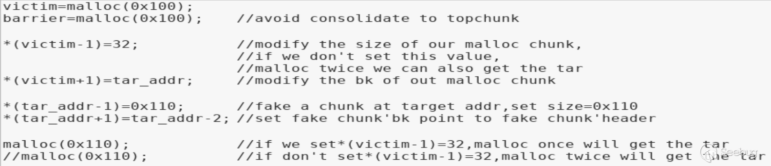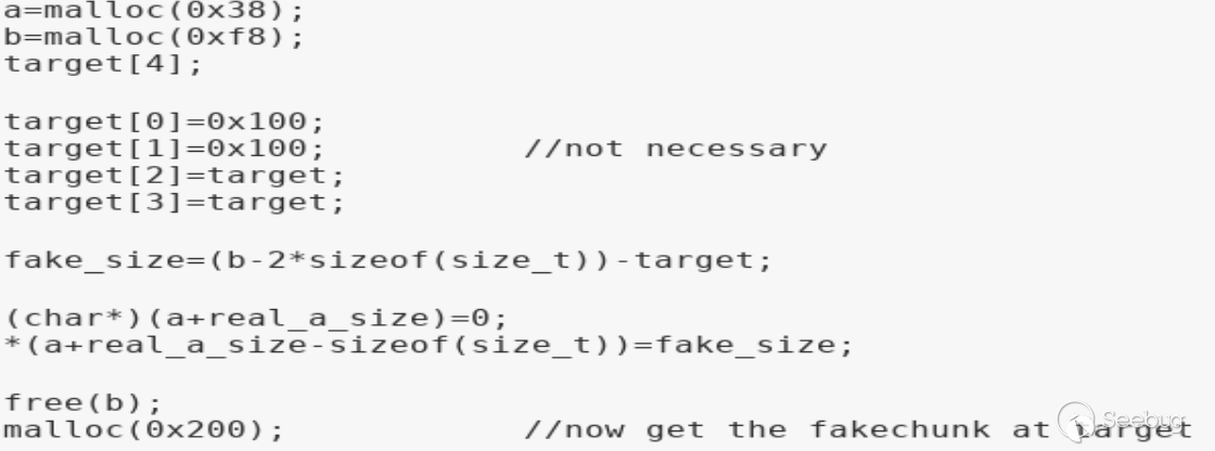 這樣通過反推target=b_chunk_header-fake_size得到fake_size=b_chunk_header-target。