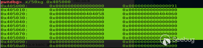 最后構造的fakechunk+chunk1部分數據如下,chunk0堆頭0x405000,fakechunk堆頭0x405010,chunk1堆頭0x405090,圖中選中部分為fakechunk