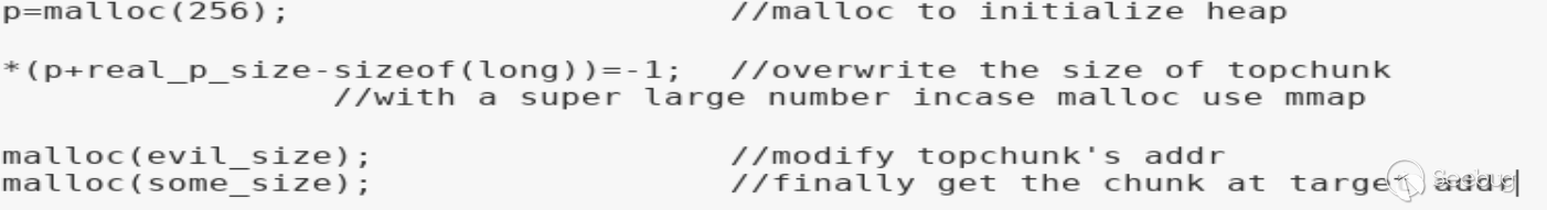 首先通過一次堆溢出覆蓋topchunk的size域為一個超大的整數(如-1),避免申請內存時進入mmap流程。